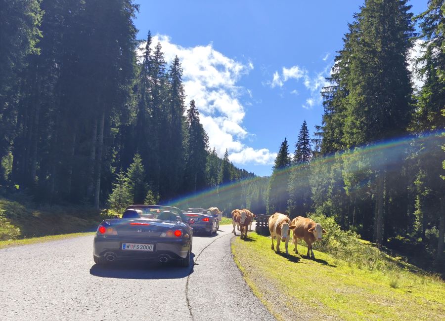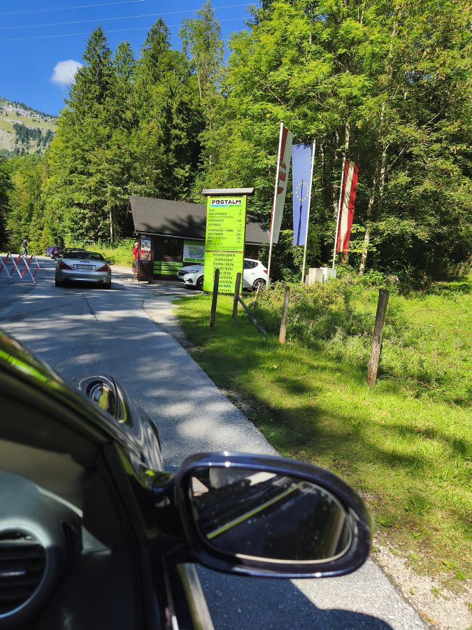 Wieder konnten wir die österreichische Romantik Straße entlang dem Wolfgangsee nach Strobl genießen. Wir erreichten die Postalm Mautstraße und konnten hier ein Gruppenmautticket lösen. Jetzt ging es auf der gut ausgebauten Mautstraße in zahlreichen Serpentinen hoch auf 1.603 m. Die Fahrt auf der Almstraße war durch zahlreiches Weidevieh, fleißig strampelte Radfahrer und Teilnehmer eines VW luftgekühlten Fahrzeugtreffens eine zusätzliche Herausforderung, aber erlaubte uns des Öfteren den Blick auf die umliegende Bergwelt zu genießen.
