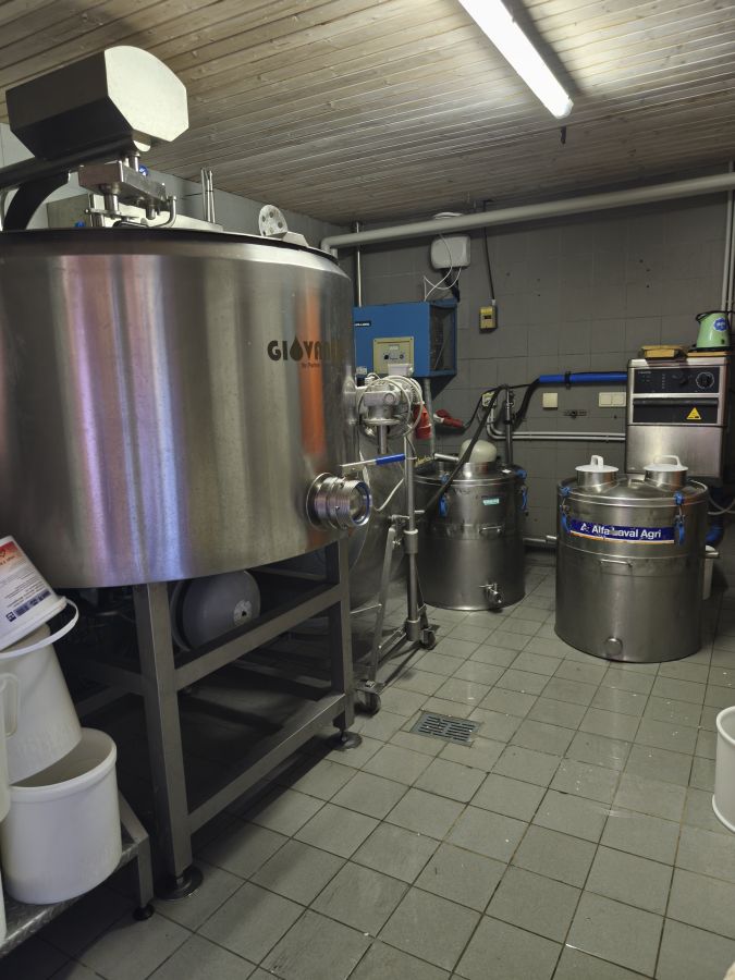 Vor der Abfahrt konnten wir noch die Käserei und die zahlreichen Käselaibe bewundern. Natürlich bekamen die Interessierten eine Einführung in die Alm-Käse-Herstellung. Die frische Rohmilch wird erhitzt und mit natürlichem Lab versetzt. Der so entstehende Käsebruch wird in Formen gefüllt, gepresst und in ein Salzbad gelegt. Anschließend reift er im Käsekeller, wo er gepflegt und mit Salzlake geschmiert wird.