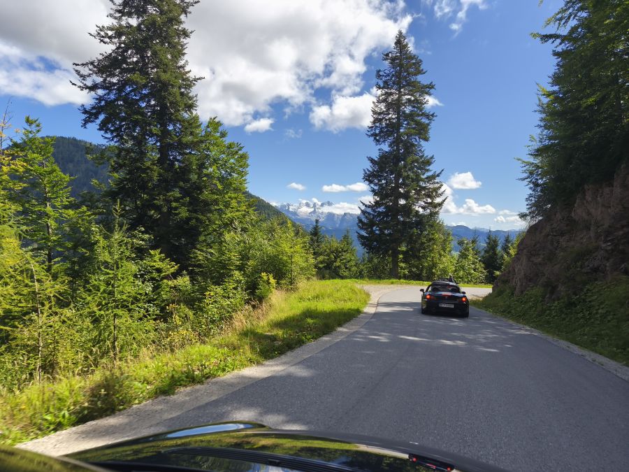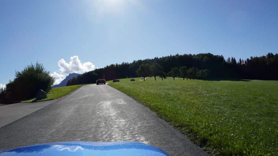 Teile dieser Strecke werden als österreichische Romantikstraße bezeichnet. Beim RED Bull Verwaltungszentrum in Fuschl ging es dann rechts auf Nebenstraßen in Richtung Faistenau. Dank des etwas trüben Wetters war wenig Verkehr und wir konnten die Landschaft mit geöffnetem Verdeck genießen.