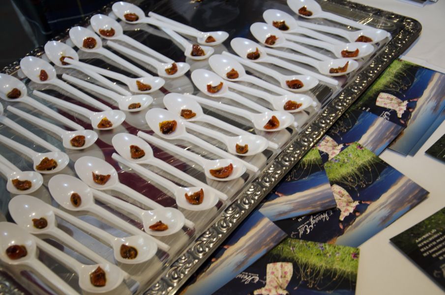 Am Hotel Erlenhof angekommen, regnete es immer noch. Daher hat man die ganze Veranstaltung kurzerhand vom Freien in das Hotel verlegt. Wie das den Organisatoren in so kurzer Zeit gelungen ist, bleibt ein Rätsel. Unser heutiger Reiseführer Adi Weisch (Villa Luise, Faak) und der Genussbotschafter Herwig Ertl moderierten dann ein Drei-Länder-Genussfest mit auserwählten Delikatessen aus Slowenien, Italien und Österreich. Überall waren kleine Stände, an denen etwas gezeigt und erklärt wurde und man die Köstlichkeiten probieren konnte: