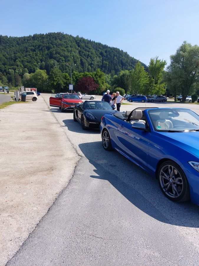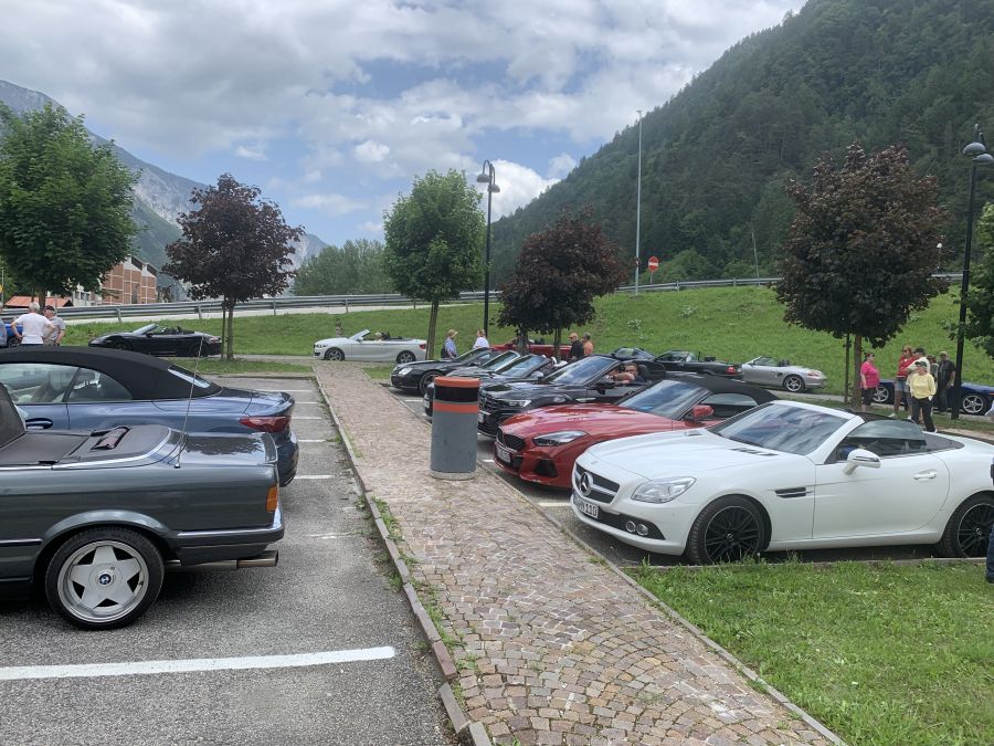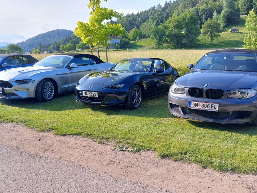 Im für gelungene Fotos bestens geeigneten Abendlicht entstanden hier wieder schöne Bilder unserer Cabrios mit dem an eine Almlandschaft erinnernden Berghang oder dem Restaurant im Hintergrund. Nach dem Essen saßen wir noch in gemütlicher Runde zusammen, denn seit dem letzten Treffen hatte man ja so viel zu erzählen! Die Stimmung war geprägt von freudiger Erwartung auf die kommenden Tage, denn heute war es vormittags noch etwas frisch gewesen, aber für Samstag waren höhere Temperaturen vorhergesagt worden.