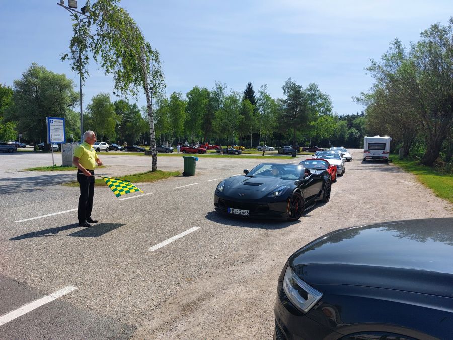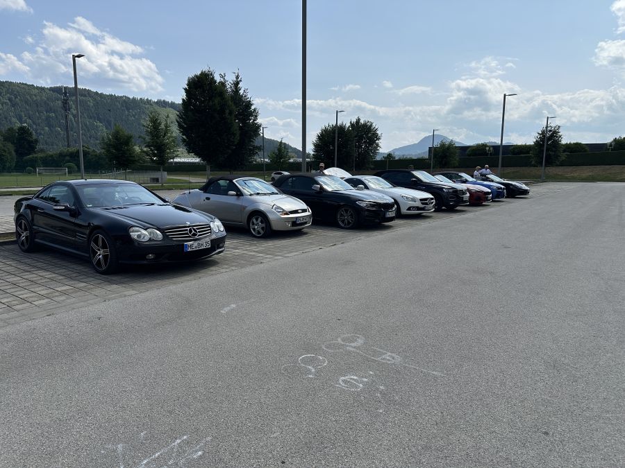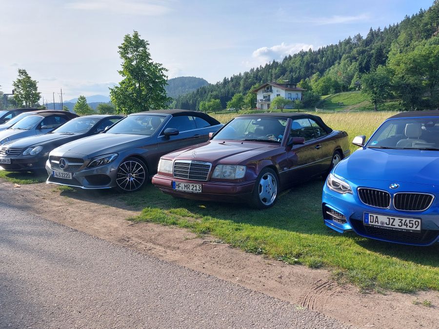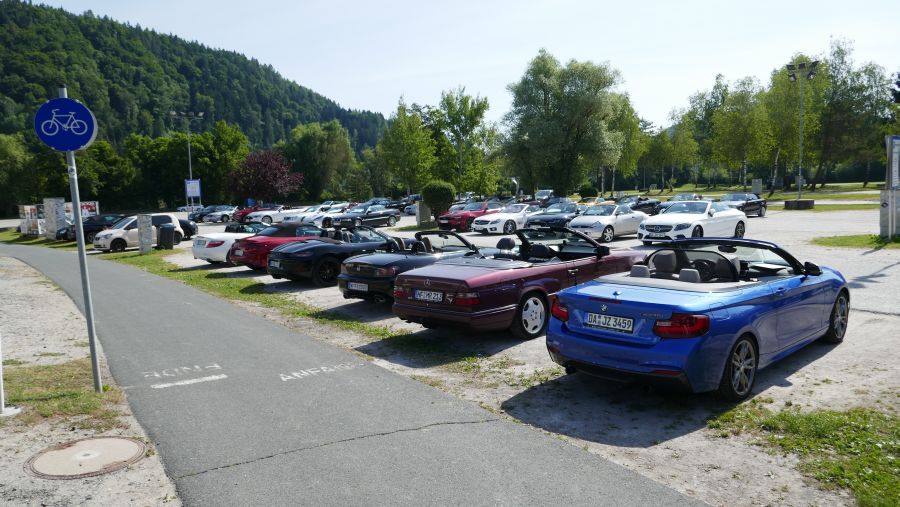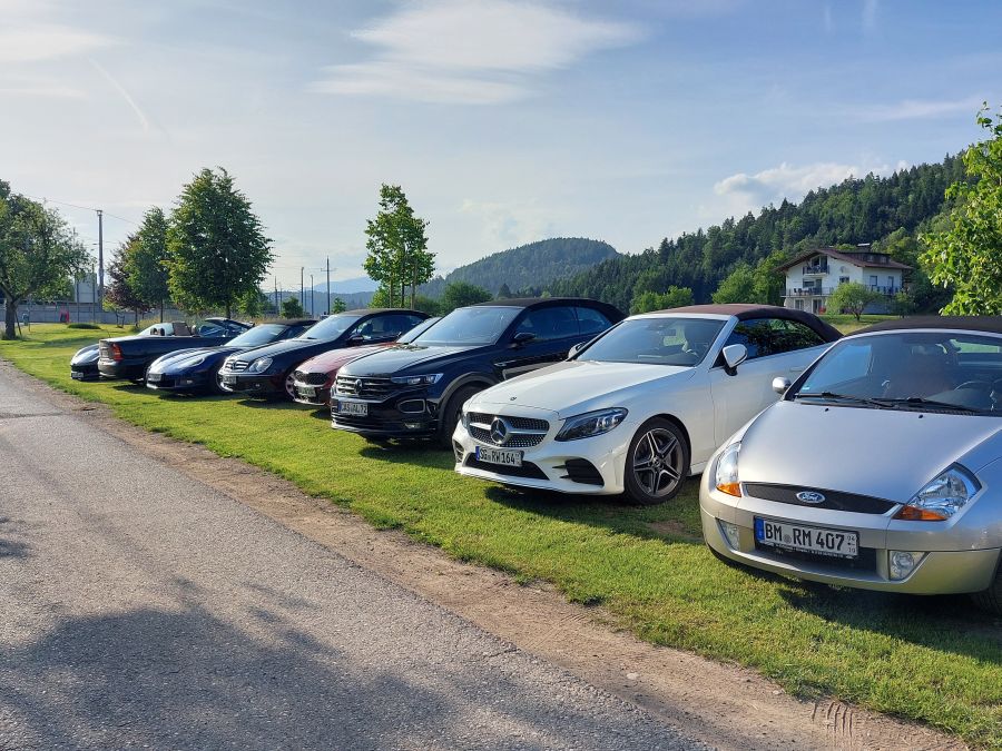 Nach Werners Ansprache wurden die einzelnen Fahrzeuggruppen für die Ausfahrten gebildet. Das Konzept, nicht mehr in einer einzigen großen Kolonne zu fahren, sondern zeitversetzt in kleineren Gruppen unterwegs zu sein, hat bereits bei vergangenen CFF-Ausfahrten seine „Feuerprobe“ bestanden. Damit halten wir behördliche Vorgaben ein und profitieren von einer größeren Toleranz der ortsansässigen Bevölkerung, wenn wir mit unseren Cabrios unterwegs sind. Und auf schmalen Sträßchen werden Ausweichmanöver wesentlich entspannter.