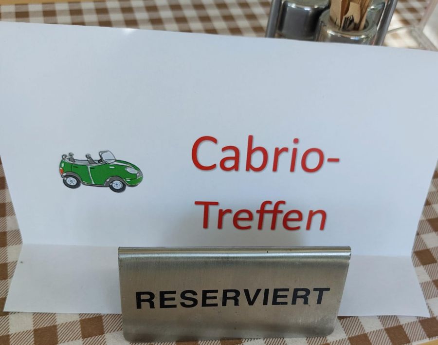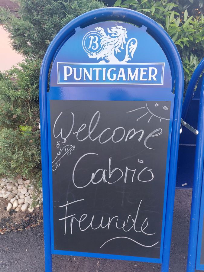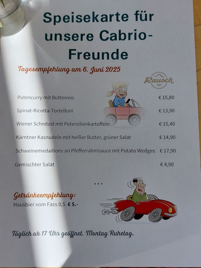 Wie schon in den letzten beiden Jahren trafen wir uns zum Abendessen im idyllisch gelegenen Gasthof Rausch in Unterferlach. Das Restaurant überraschte uns mit individuell für uns kreierten Reservierungshinweisen auf den Tischen und einer „Speisekarte für unsere Cabriofreunde“, die ebenfalls kreativ und humorvoll gestaltet war. Auch die Wiese, auf der wir unsere Cabrios abstellen durften, war augenscheinlich frisch für uns gemäht worden. Über solche „Kleinigkeiten“ freut man sich, weil sie von Wertschätzung zeugen. Hier fühlt man sich als Gast willkommen!