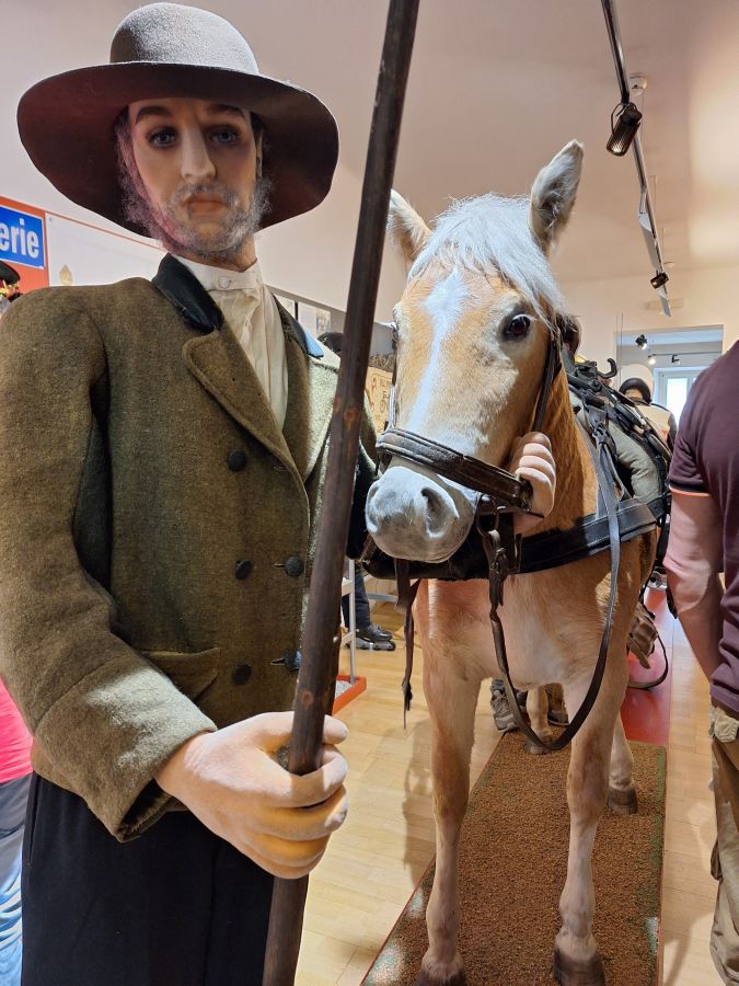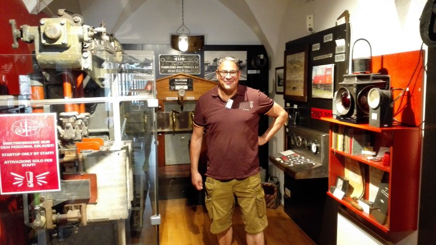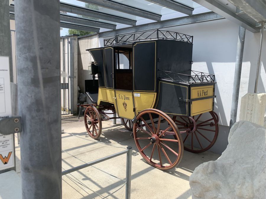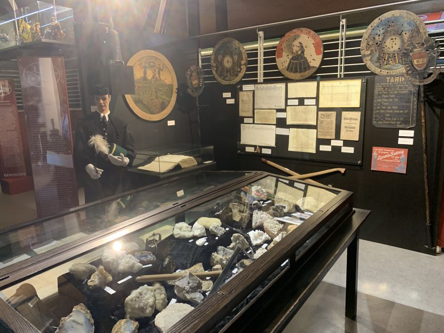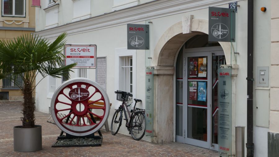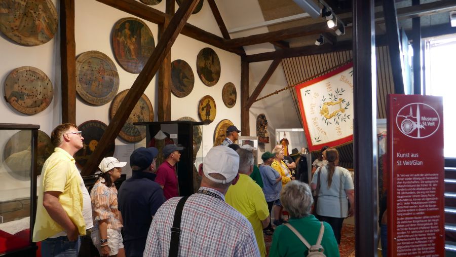Wir parkten bei der „Blumenhalle“ und hatten den großzügigen Parkplatz fast für uns allein, so dass auch hier eine gute Gelegenheit war, unsere vierrädrigen Schätzchen im Ensemble abzulichten. Das Museum am Hauptplatz in St. Veit war in gut 5 Minuten Fußmarsch schnell zu erreichen. Es hatte über die Mittagszeit extra für uns geöffnet, und als wir dort eintrafen, warteten schon drei motivierte Museumsführer auf uns. Diese brachten uns, jeweils in verschiedenen Abteilungen des Museums beginnend, die sieben Themenschwerpunkte in kompetenter und unterhaltsamer Weise näher. Während der etwa einstündigen Führung erhielten wir einen interessanten Einblick in die umfangreiche Sammlung.