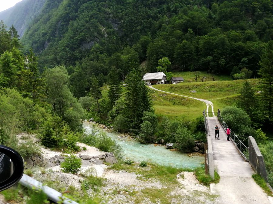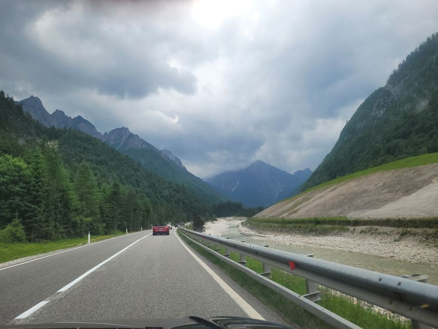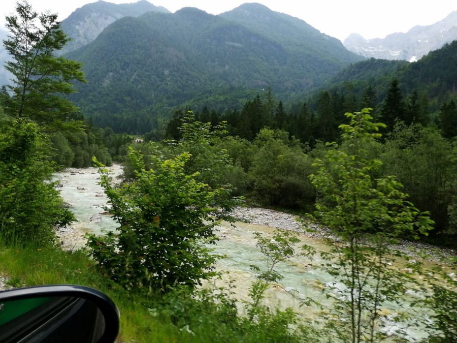 Auch wenn die Abfahrt von unserem heutigen Zwischenziel wegen der nicht ganz vorhersehbaren Parksituation zunächst etwas angespannt verlief, änderte sich dies sehr bald, nachdem alle Fahrzeuge auf der Piste waren: Das herrliche Socatal säumte unsere Route, und sicherlich dachte der eine oder andere beim Vorbeifahren daran, wie „cool“ (im doppelten Wortsinne) es wäre, mal im türkisblauen Wasser dieses herrlichen Gebirgsflusses zu baden oder zumindest die von der Pedalarbeit im Cabrio warmen Füße zu kühlen ;-).