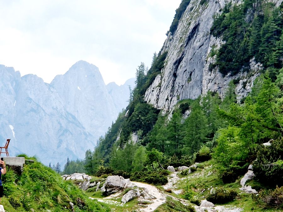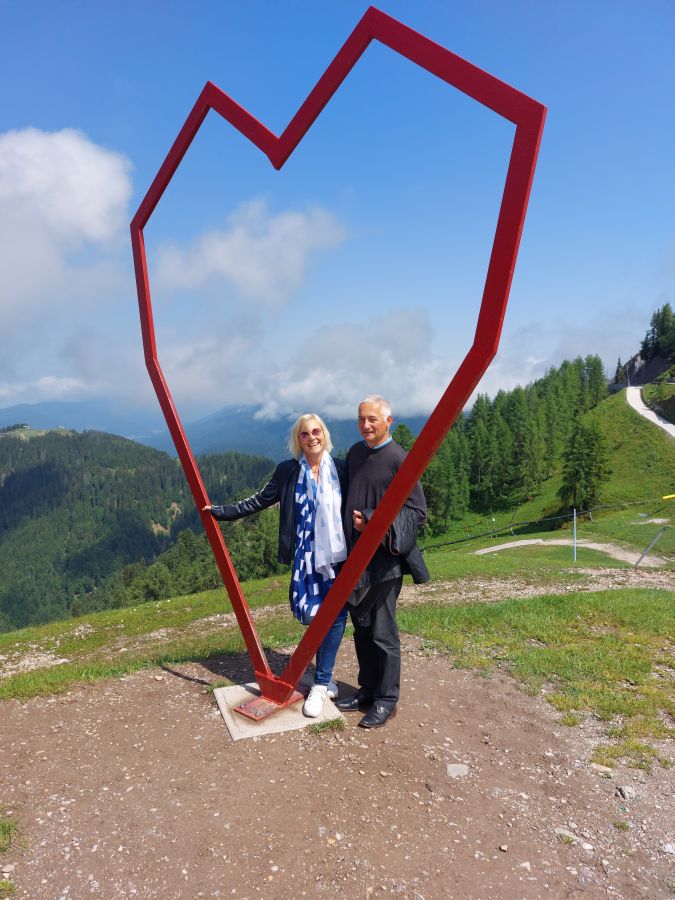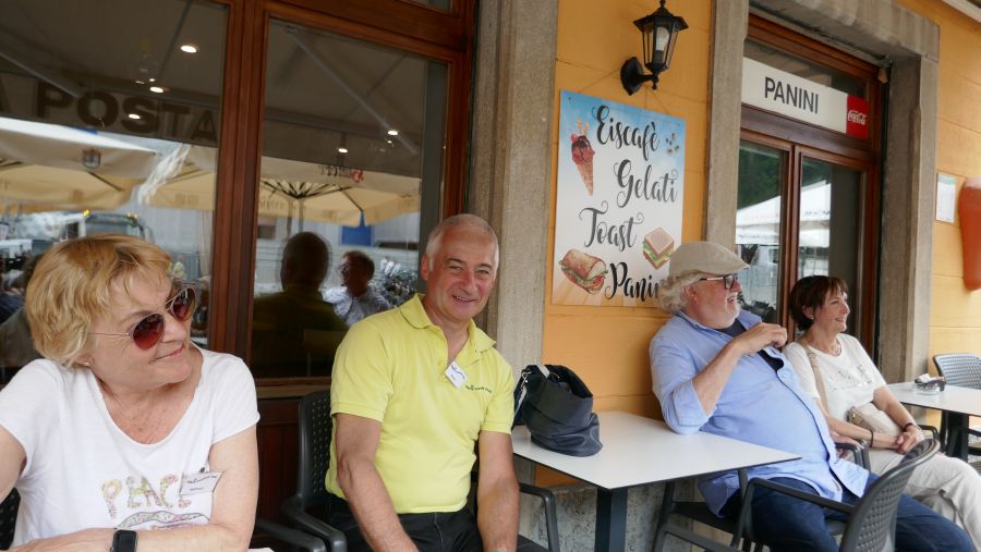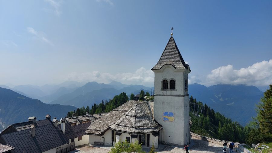 „Experimentierfreudige“ wie Brigitte und Werner sowie Ulli und Hans nutzten den späten Pfingsttermin für eine Seilbahnfahrt auf den Monte Lussari, einen Wallfahrtsort oberhalb von Tarvisio. Dies war wegen der grandiosen Lage des Ortes vor der imposanten Bergkette der Julischen Alpen ein sehr lohnender Ausflug, der aber so nur im Juni möglich ist, weil die Bergbahn zuvor noch in der Winterpause ist.