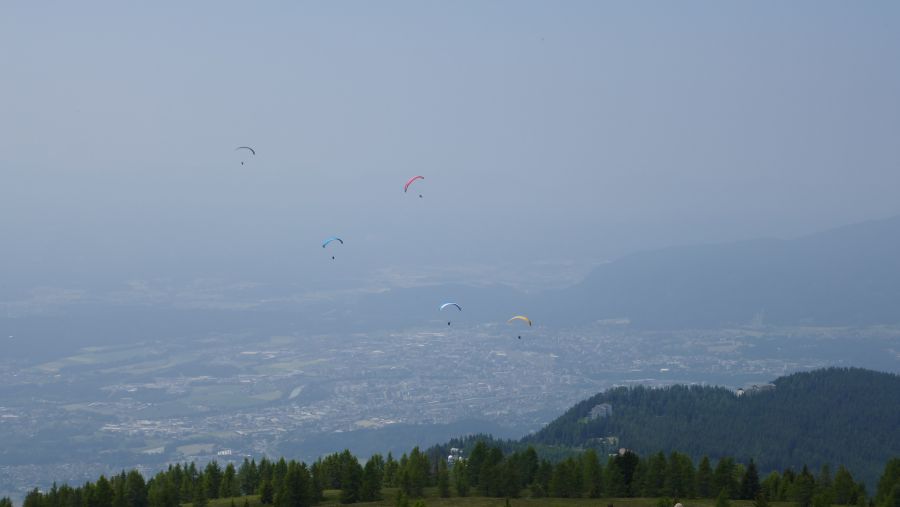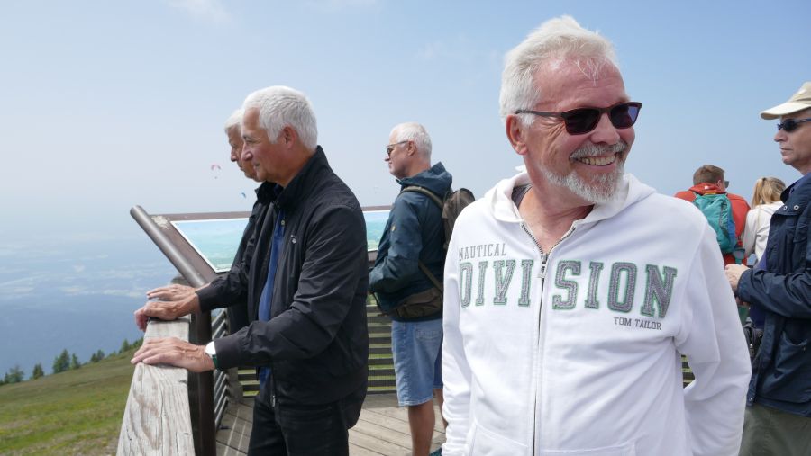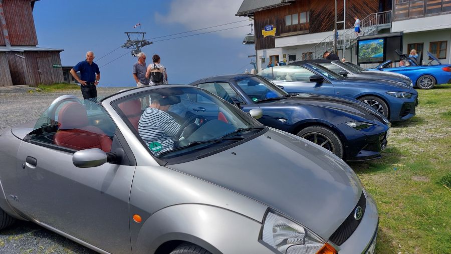 Leider waren die Sichtverhältnisse auf Grund der durch die Waldbrände in Kanada verursachten Aschewolke in der Atmosphäre so eingeschränkt, dass der Faaker See in trübem Grau lag und die Karawanken kaum noch erkennbar waren. Aber die diversen Strudel aus der Berghütte schmeckten lecker, und wir hatten mit unseren sechs Cabrios den „Höhenrekord“ des offiziellen Teils des Treffens gebrochen, denn wir standen auf gut 1900 Meter Höhe. Wenn das nichts ist!