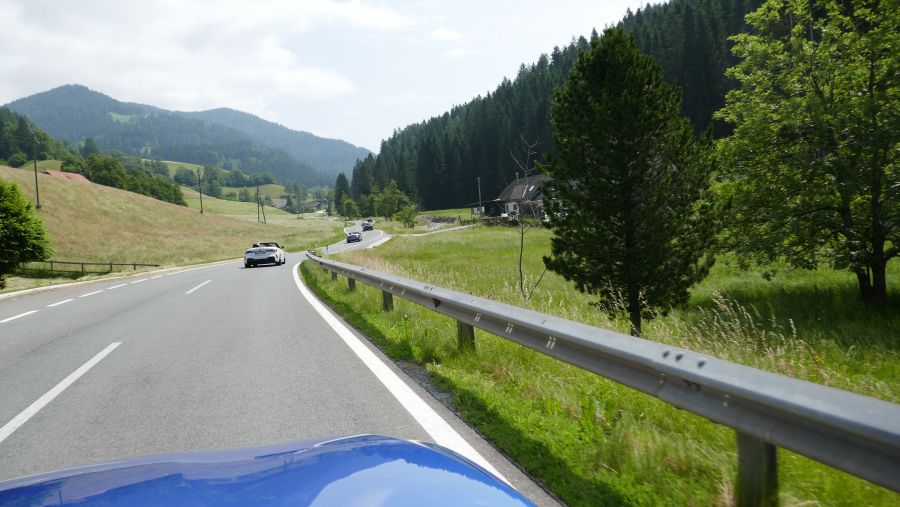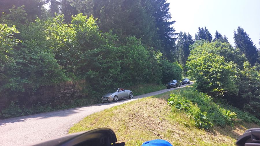 Trotz des etwas zweifelhaften Wetters waren gerade an diesem Tag die Erwartungen besonders hoch. In bewährter Manier starteten wir, teils mit geöffnetem, teils mit geschlossenem Dach, in sieben überschaubaren Gruppen ab 10:30 Uhr Richtung Wurzenpass. Dieser Grenzpass zwischen Österreich und Slowenien hat es in sich: Er ist zwar nicht besonders hoch (1073 Meter), ist aber stellenweise sehr steil.
