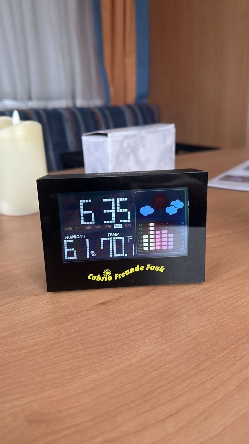 Als Begrüßungsgeschenk erhielt jedes Team eine Wetterstation mit CFF-Logo und verschiedenen Funktionen, ein für Cabriofahrer eigentlich unverzichtbares Accessoire. Schließlich möchte man idealerweise vor jeder größeren Tour wissen, ob das Wetter „hält“, denn man möchte ja am liebsten immer mit offenem Verdeck unterwegs sein!