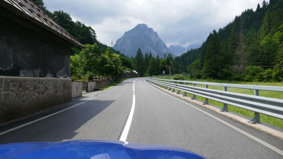 Die Ausfahrt führte zunächst eher unspektakulär durch das Gailtal nach Hermagor. Kurz danach schwenkten wir Richtung Süden ein und eroberten in mehreren Serpentinen den 1530 Meter hohen Nassfeldpass. Dieser war mehrere Jahre lang auf italienischer Seite gesperrt. In dieser Zeit wurden einige „kritische“ Stellen entschärft. Trotzdem ist dieser Pass landschaftlich, aber auch fahrerisch ein Höhepunkt unter den Pässen in nicht allzu großer Entfernung vom Faaker See. Die Abfahrt hinunter nach Pontebba glänzt (aus Cabriofahrersicht) mit zahlreichen Serpentinen und eindrucksvollen Felswänden unmittelbar neben der Straße. Als „Schmankerl“ kommen noch abenteuerliche Tunneldurchfahrten hinzu.