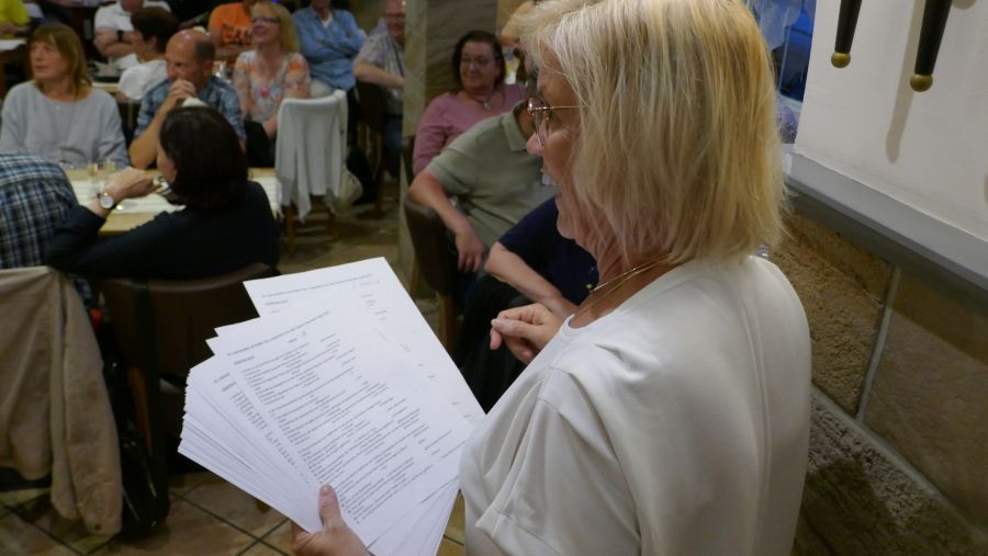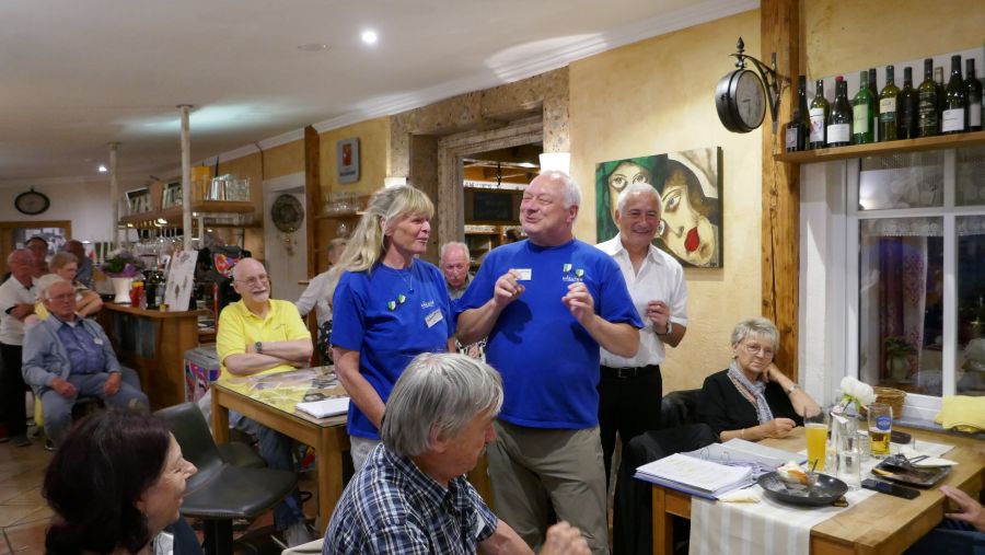 Auch dieses Jahr hatten Brigitte und Werner wieder ein spannendes Quiz für das Abendprogramm ausgetüftelt, diesmal zum Thema „Kärnten“. Passend zum Thema des Quiz hatte Werner sogar ein schwarzes Gilet mit aufgesticktem roten Kärnten-Aufdruck angezogen! Die Fragen sollten im Multiple-Choice-Verfahren beantwortet werden, was in vielen Fällen nicht so leicht war, wie es sich anhört.