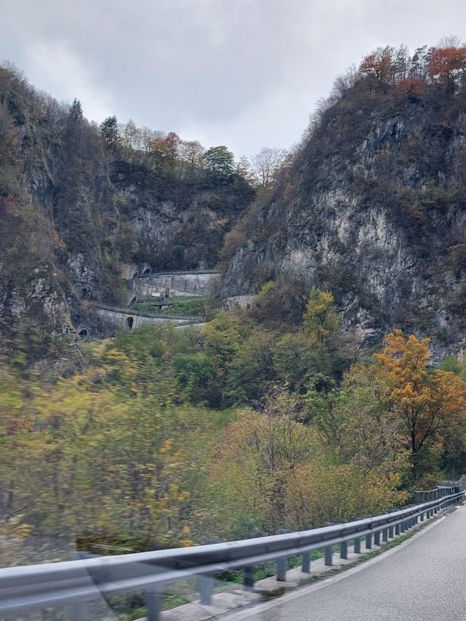 Noch etwas ergriffen von den Eindrücken, die wir an diesem schicksalsschweren Ort sammelten, begaben wir uns am frühen Nachmittag auf die Weiterreise über die Nordrampe des 1742 Meter hohen Berges hinunter nach Feltre. Diese Strecke wurde erst vor kurzem sichtbar etwas ausgebaut und an besonders gefährlichen Stellen mit Leitplanken gesichert. Sie ist trotzdem eng geblieben und erfordert, bei der Bergauffahrt sicherlich noch mehr als bergab, eine gewisse Routine beim Fahren im Gebirge, um mit Genuss befahren werden zu können.