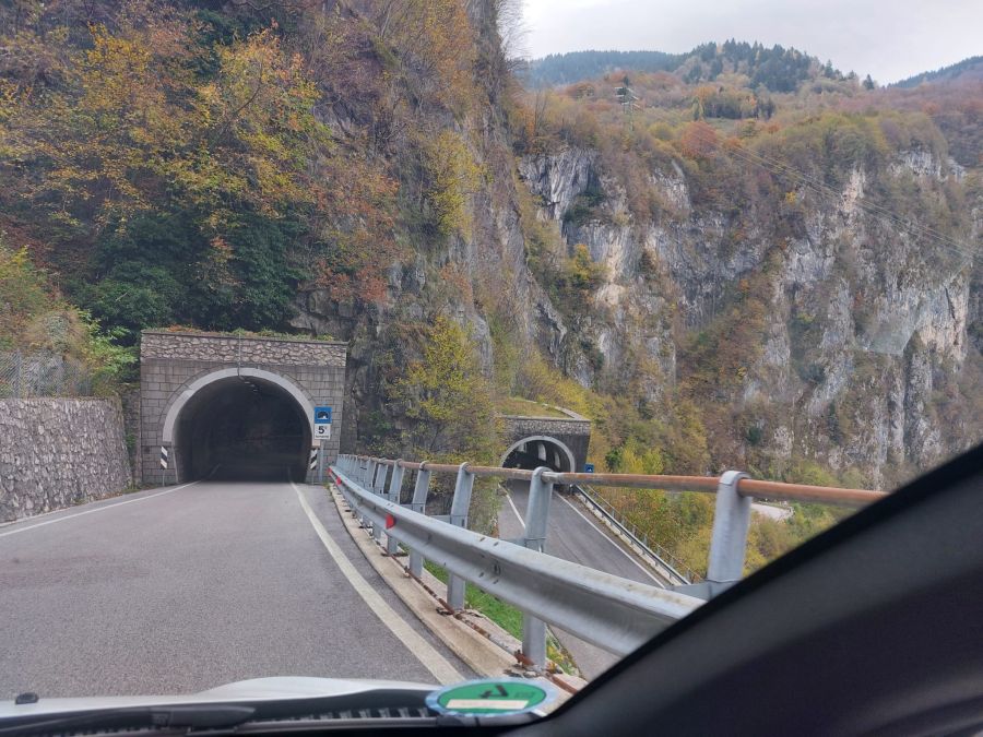 So war es auch. Nach einem kurzen, harmlosen Auftakt stürzte sich die Straße vehement in die Tiefe. Vor uns tauchte die erste Serpentine auf, an der die Aufschrift „Tornante 20“ prangte. Das konnte ja heiter werden! Das Navi malte inzwischen blitzende Zuckungen auf Brigittes Handydisplay und die Felsen, mal rechts, mal links unmittelbar neben der Fahrbahn bewiesen, dass auch hier eine Trasse direkt in einen felsigen Steilabhang hinein verlegt worden war. Die Fahrt ins Tal erforderte äußerste Konzentration, denn es ging schon Richtung Abend zu, so dass uns bereits der eine oder andere in Bassano arbeitende Pendler in rasanter Fahrt entgegenkam. Um diese Zeit wollen eben alle nur möglichst schnell nach Hause, da kommt einem auch normalerweise niemand entgegen!