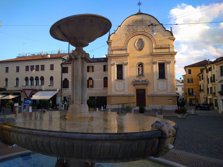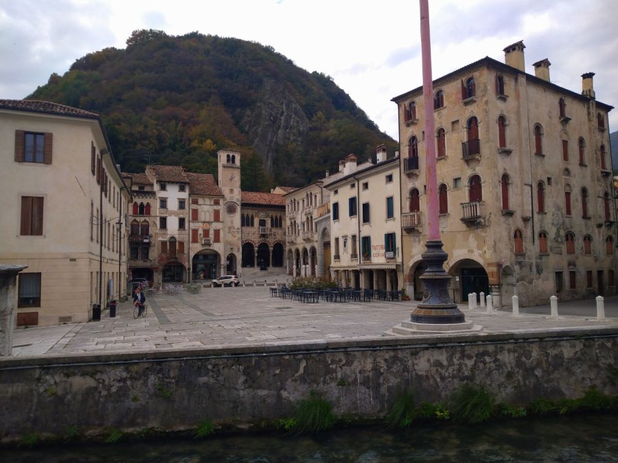 Am nächsten Tag war es leider schon wieder vorbei mit dem Sonnenschein, aber dadurch ließen wir uns nicht verdrießen. Zur üblichen Zeit starteten wir Richtung Osten und erreichten nach etwa 45 Minuten Fahrzeit die Kleinstadt Cornuda. Die Strecke dahin ist im Großen und Ganzen eher unspektakulär, weil sich ein Dorf an das nächste reiht. Wer jedoch die Blicke schweifen lässt, entdeckt spannende Bauwerke links und rechts vom Wegesrand, seien es Kirchen mit monumentalen klassischen Säulen im Eingangsbereich und freistehenden, oft recht stattlichen Kirchtürmen (Campanile) oder aber auch Villen und Paläste von Adeligen aus der venezianischen Zeit, welche die Handschrift des in dieser Region allgegenwärtigen Renaissance-Baumeisters Andrea Palladio (1508 – 1580) zeigen.