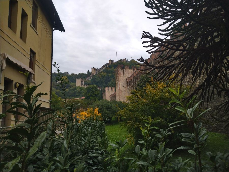 War am Vortag der Himmel nur bedeckt gewesen, wollten nun die Wolken die gespeicherten Wassermassen loswerden: Es regnete, und das nicht zu knapp. Nach dem Frühstück legte sich der Regen jedoch etwas, so dass sich unsere Stimmung ebenfalls aufhellte und wir recht optimistisch unser erstes Tagesziel ansteuerten. An Cabriofahren war zwar nicht zu denken, aber der Ort Marostica, gerade mal 10 Kilometer von unserem Hotel entfernt, wirkte auch bei trübem Wetter sehr stimmungsvoll. Über dem Ort thront eine Burgruine, von der auf beiden Seiten wuchtige Wehrgänge bis hinunter in die Stadt führen, welche sie auf beiden Seiten begrenzen. Im Ort selbst steht ebenfalls eine burgähnliche Anlage mit auffälligen Zinnen, die an die Scaliger-Burgen in der Lombardei erinnern.
