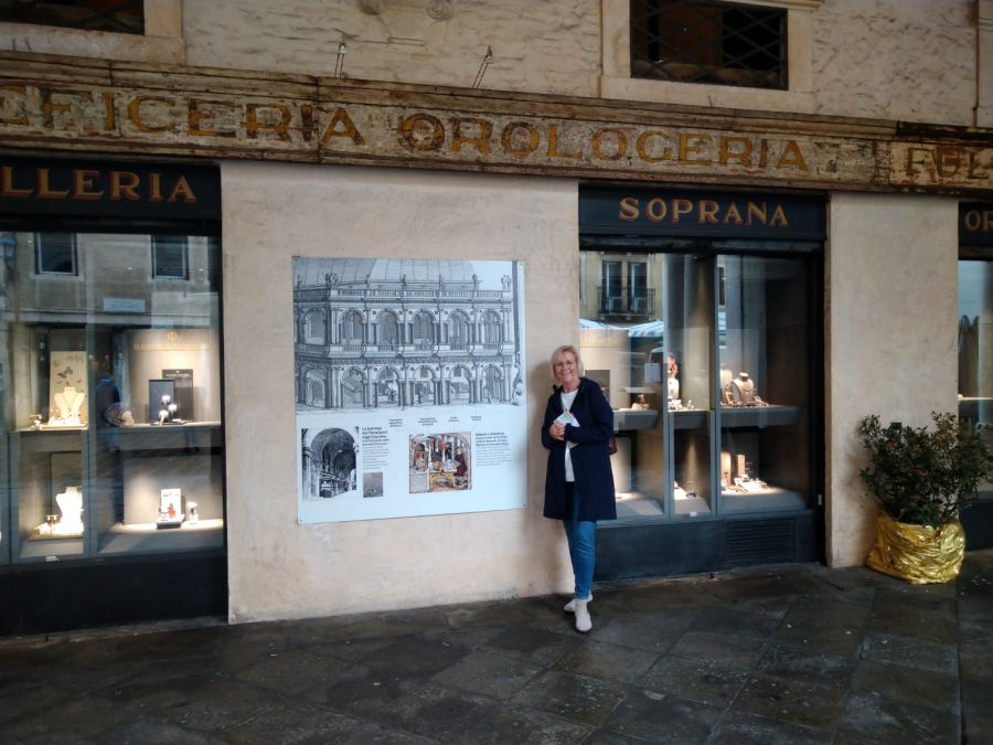 Heute wird das Erdgeschoß der Basilika von verschieden Läden genutzt, unter anderem auch von Schmuckgeschäften. In den Gassen um die Piazza dei Signori findet sich ein großes gastronomisches Angebot an Cafés, Bistros und Restaurants der verschiedensten nationalen Ausrichtungen. Wir fanden bald ein Café, welches eine große Auswahl an Kuchen, aber auch herzhaften kleinen Snacks wie beispielsweise Focaccia im Angebot hatte. Dort ließen wir uns zur Mittagsrast nieder und veredelten unseren mittäglichen Imbiss mit einem Gläschen Prosecco. Das ist hier gar nicht ungewöhnlich, und warum soll man sich solche lokalen Gewohnheiten nicht auch mal abgucken, wenn man auf Reisen ist?