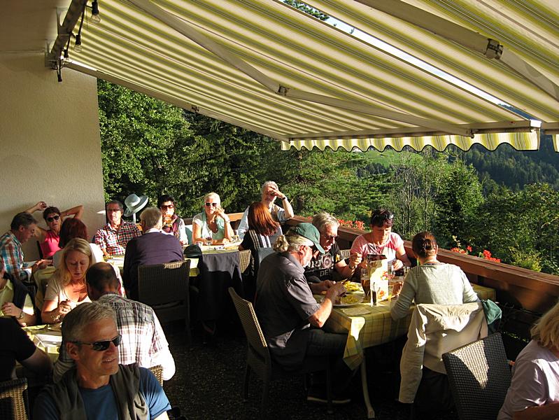 Eigentlich hätten wir noch ein paar Stunden hier verweilen und in Erinnerungen schwelgen können, aber Hannelore und Hermann haben, ganz perfekt, auch an das Abendessen gedacht und Tische auf der Terrasse vom Gasthof Paradies in Eichenberg (A) oberhalb von Bregenz gebucht. Der Weg dorthin ist zum Teil steil und sehr kurvenreich, da ist Hupen vor jeder Kurve vorsorglich angesagt.