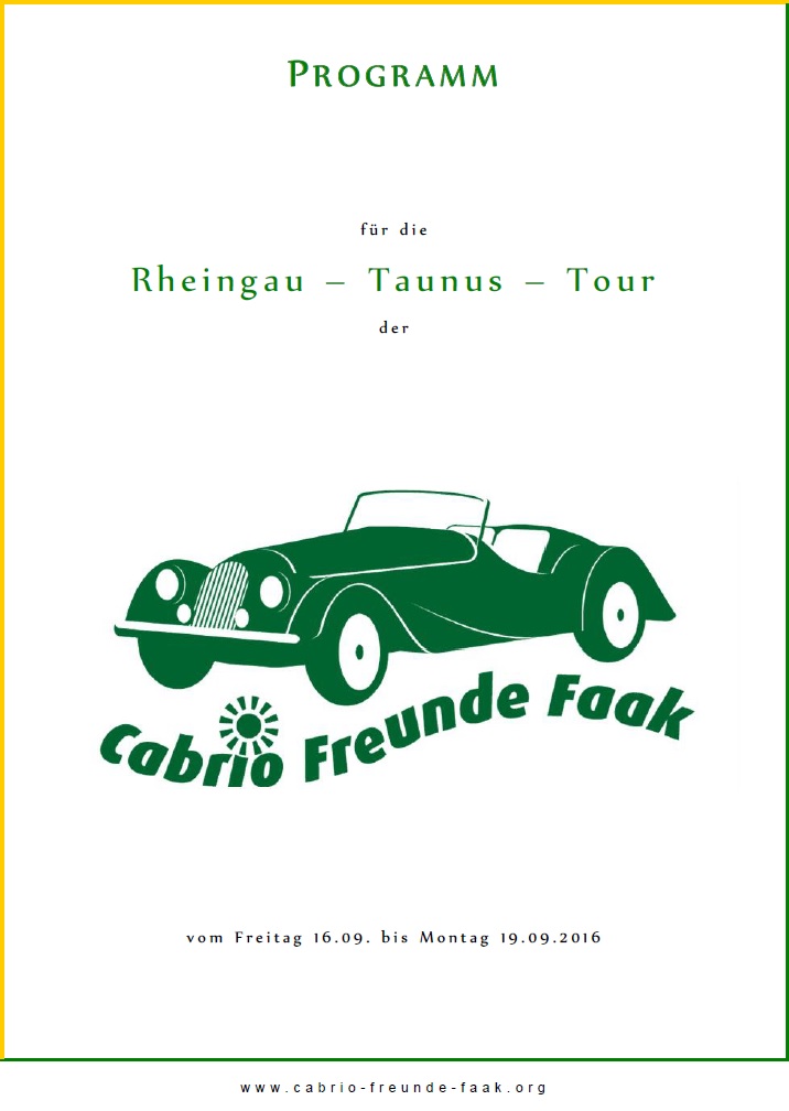 Anne und Udo haben mit Unterstützung von Sandra und Marc eine mehrtägige Cabriotour in der Rheingau-Taunus-Region vorbereitet und ihre Cabriofreunde dazu eingeladen. Die Planungen begannen bereits Anfang des Jahres; schon im April sind Hotelzimmer reserviert und alle CFF-Mitglieder per E-Mail-Rundschreiben informiert worden.