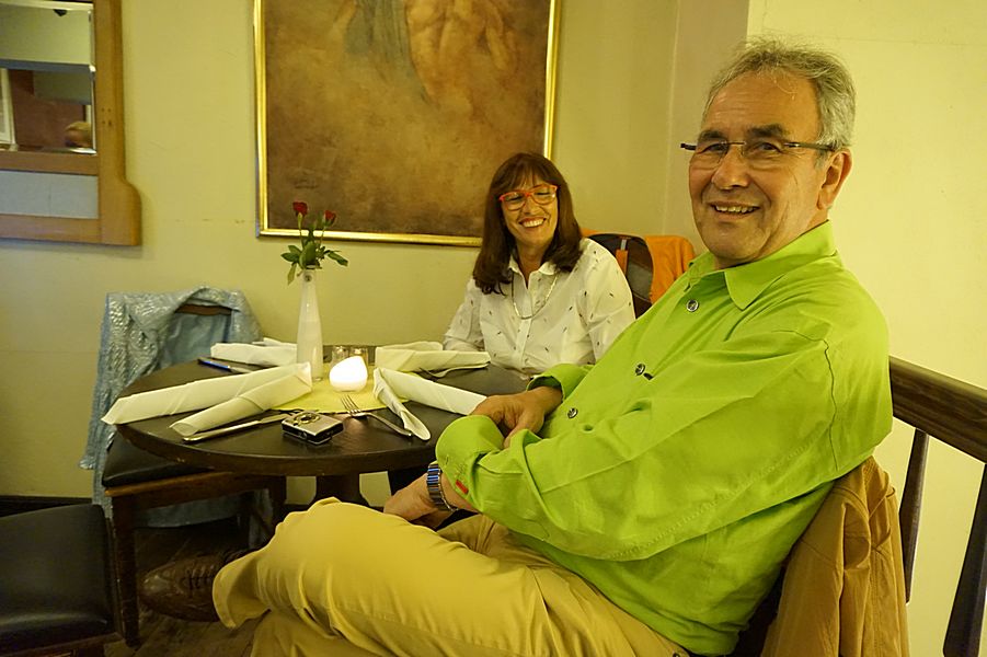 Danach fangen wir an, die Speisen- und Menükarten zu studieren, die uns von der überaus freundlichen Bedienung übergeben werden und wählen aus. Teils mit Vorspeisen, teils ohne, aber alle mit einem Dessert zum Abschluss. Dem Bekunden nach war das Essen toll dekoriert, reichlich und hat allen sehr gut geschmeckt, selbst unseren versierten Hobbyköchen. Die Preise waren angemessen, wenn auch auf einem etwas höheren Level.
