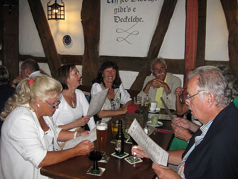 Die ersten Cabrioten treffen so gegen 16 Uhr ein und - wie üblich beim CFF - ist die Wiedersehensfreude groß. Während einige sich einen Eindruck vom umfangreichen Hessenpark verschaffen, sitzen die anderen schon in gemütlicher Runde im Wirtshaus Zum Adler zusammen. Die Menükarte ist auf Hessisch und so benötigen die meisten eine Übersetzungshilfe. Wer kann sich schon unter "Gebackenes Woihinkelche fast ohne Knochen mit Gemüsestroh" etwas vorstellen oder traut sich, die mehrfach angepriesene "Grie Soß" zu probieren?