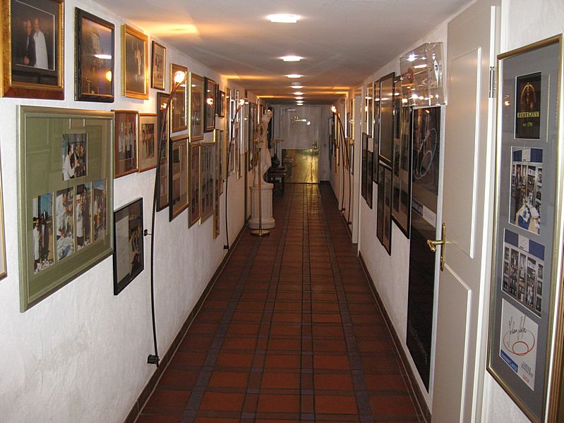 Wir werfen noch einen Blick in die anderen Räumlichkeiten, wie z. B. dem Le Val d’Or, dem Gourmet-Lokal für den Abend und bewundern die Bildergalerien mit Persönlichkeiten, für die der Chef schon gekocht hat.