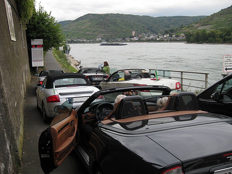 Nach 2 ½ Stunden geht es weiter. Über kurvenreiche Straßen fahren wir nach Bacharach und am Rhein entlang bis Niederheimbach. Dort nehmen wir eine kleinere Fähre nach Lorch und fahren weiter nach Assmannshausen.
