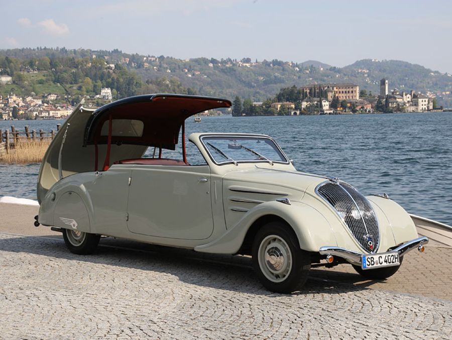 Urvater aller Coupé-Cabrios: der Peugeot Eclipse aus den 30er-Jahren im typischen Vorkriegsdesign, hier als viersitzige Version 402. Das Heck des Modells war so lang, dass sein Coupédach ohne Teilung in zwei Hälften darin untergebracht werden konnte.