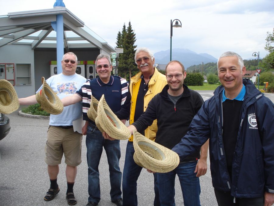 Bestens gelaunte aktive Mitglieder und Führungspersönlichkeiten unseres Clubs am Faaker See 2013 (v.l.n.r.): Hans (Webmaster), Udo (Präsident von 2012 bis 2022), Horst (Präsident von 1995 bis 2012), Thomas, Werner (Präsident seit 2022)