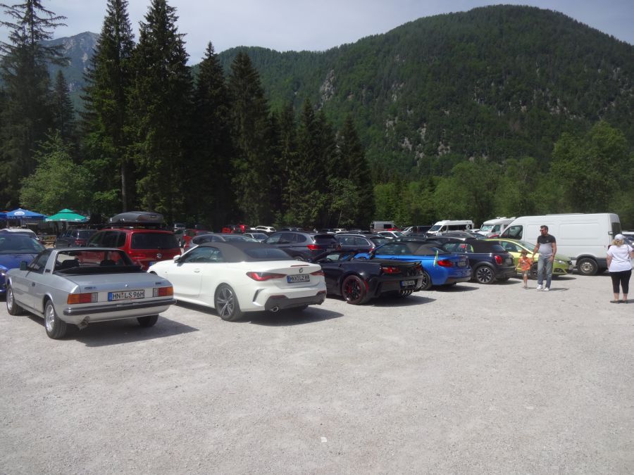 Werners Ausfahrt führte uns mit sechs Fahrzeugen über den Wurzenpass nach Slowenien und weiter Richtung Tarvisio in Italien. Denn in der Nähe der bekannten Stadt gibt es eine weniger bekannte, dafür aber umso charmantere Seenlandschaft, die Laghi di Fusine. Dort machten wir einen kleinen Halt, den manche auch zum Baden der Füße genutzt haben – mehr ging nicht, das sind ja immerhin Bergseen! Dann gab’s noch ein Tässchen Kaffee oder ein kleines Bier, bevor die Fahrt uns nach Camporosso am Fuße des Monte Lussari führte. Vor Beginn der Ausfahrt war nicht abschließend zu klären, ob die Telecabina auf den Berg fährt oder nicht – sie fuhr leider nicht.