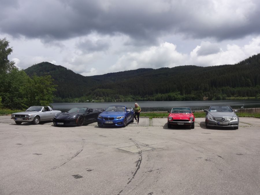 Wir starteten also früher als an anderen Tagen, um über die Autobahn etwas „Abstand“ zu den schon bekannten Strecken zu gewinnen. In Völkermarkt wechselten wir auf die Bundesstraße, um dann die erste Passstrecke in Angriff zu nehmen: über die Soboth! Dieser Pass verbindet Lavamünd in Kärnten mit der Stadt Eibiswald in der Steiermark – also wieder „Ausland“, würde der Kärntner sagen ?? Am auf der Passhöhe gelegenen Stausee gab es noch ein schönes Gruppenfoto der beteiligten fünf Fahrzeuge. Diese Straße führt zwar nicht sehr hoch hinaus, glänzt aber dafür durch eine anspruchsvolle und kurvenreiche Streckenführung. Sie ist deshalb bei Motorrad- Cabrio- und Oldtimerfahrern beliebt.