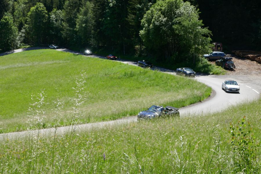 Udos Ausfahrt führte fünf Cabrios gemütlich durch das Rosental in Richtung Ferlach. Auf der Loiblpassstraße, in etwa 800 m ü. NN, bogen wir rechts ab in das Bodental, ein entlegenes Hochtal. Unser Ziel war der rustikale Gasthof Bodenbauer, auf etwa 1050 m ü. NN gelegen, wo die Straße zu Ende ist. Das Bodental ist im Sommer ein Paradies für Wanderer und im Winter für Skilangläufer. Valentin, der Bodenbauerwirt, begrüßte uns persönlich. Nach Informationen über das umliegende Bergpanorama konnten wir uns bei herrlichem Wetter erst einmal mit einer Erfrischung entspannen und den Blick auf die Märchenwiese genießen.