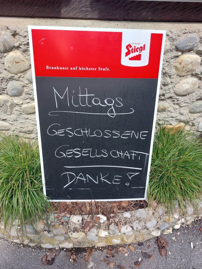 Da Brigitte bereits vor der Abfahrt die Bestellungen der Teilnehmer für das Mittagessen aufgenommen hatte, konnten unsere Wirtsleute das Essen schon vorbereiten und niemand musste lange darauf warten. Sim servierte Essen und Getränke mit einem gewinnenden Lächeln, und Barbara erzählte uns kurz vor der Abfahrt auf charmante Weise, weshalb der Esel das Logo des Gasthauses ziert. Für alle, die nicht dabei waren oder sich nicht mehr daran erinnern: der Pfarrer des Ortes ritt auf diesem Esel während der jährlichen Fronleichnamsprozession sogar bis in die Kirche hinein!