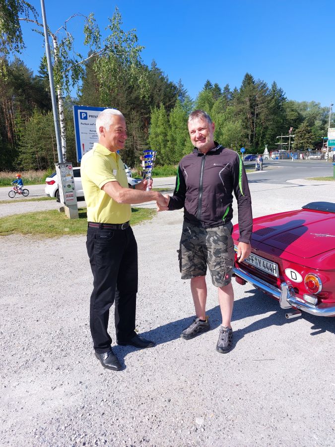 Traditionell starteten und endeten alle Ausfahrten während des Cabriotreffens wieder auf dem großen Parkplatz gegenüber dem Arneitz Village. Auch der "zweite Morgenkaffee" an den Tagen Freitag bis Sonntag hat schon eine lange Tradition, und wie immer sorgte Hans Pressinger, der Chef des Arneitz Village, großzügigerweise dafür, dass sich alle Teilnehmer vor den Ausfahrten hier nochmal stärken konnten und Werner für seine Moderation auf Mikrofon und Tonanlage zurückgreifen durfte. Dafür bedankte sich Werner bei Familie Pressinger mit einem Weinpräsent aus seiner Heimat.