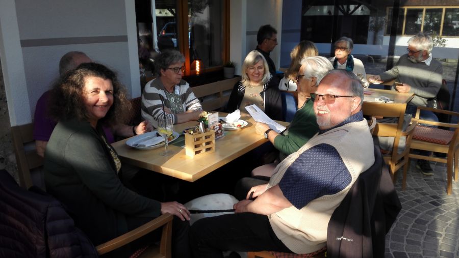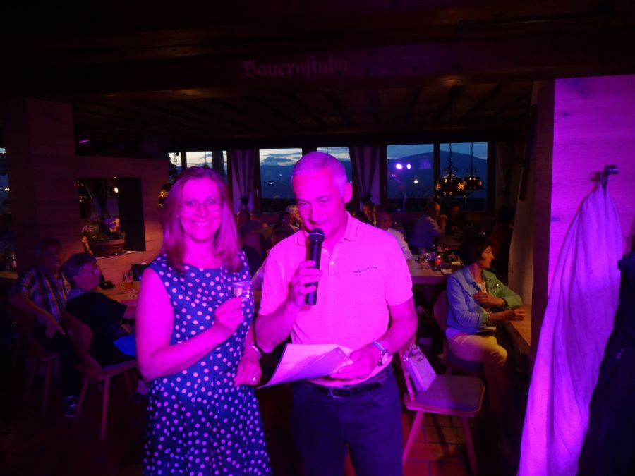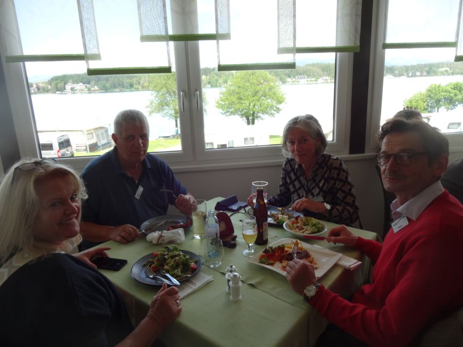 Zum Abendprogramm versammelten wir uns dieses Jahr im Baumgartnerhof hoch über dem Faaker See, von dessen Terrasse man herrliche Ausblicke auf unseren Lieblingssee und die Berge nördlich davon hat. Nach dem Abendessen (à la carte) spielten Rici und Norbert bekannte Rhythmen und sorgten mit ihrer schwungvollen Darbietung dafür, dass die gute Stimmung bei den dann noch Anwesenden bis 23 Uhr anhielt.
