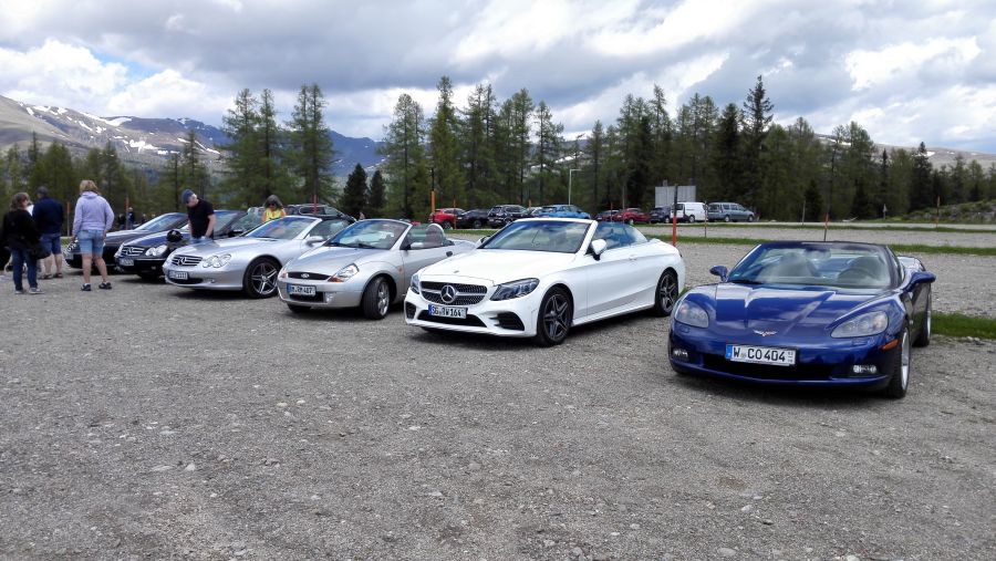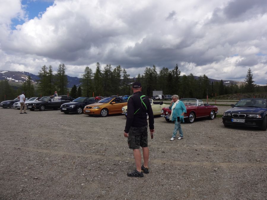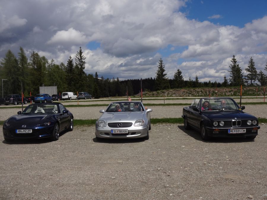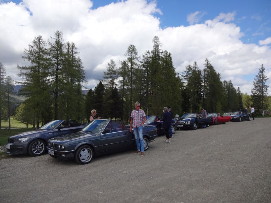 Weiter ging es über Sirnitz zum heutigen "Höhepunkt" der Tour, der 1617 Meter hoch gelegenen Hochrindl. Laut Programm war dort eine Einkehr im "Sternenberg-Gasthof" eingeplant. Leider hatten die Restaurantbesitzer nichts Besseres zu tun, als uns kurz vor dem vereinbarten Termin durch einseitig veränderte und nicht abgesprochene Vorgaben zu veranlassen, dort abzusagen. Deshalb stellten wir hier nur unsere Cabrios zum Fotoshooting mit alpinem Hintergrund auf und fuhren bald wieder talwärts Richtung Mittagspause in Bad Kleinkirchheim.