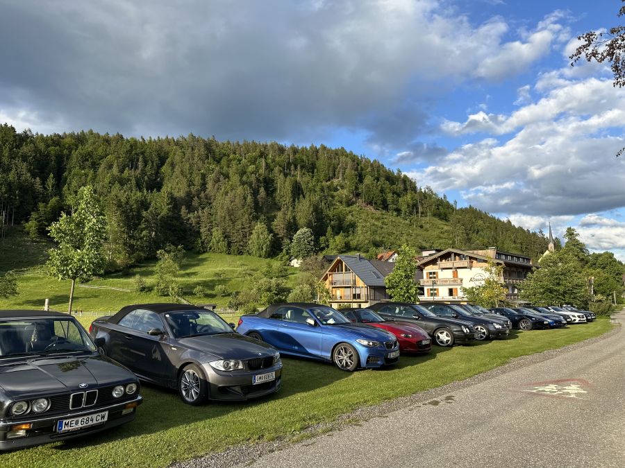 Wie schon im letzten Jahr trafen wir uns zum Abendessen im Gasthof Rausch in Unterferlach. Auch dieser Gasthof hatte für uns seine reguläre Öffnungszeit um einen Tag vorgezogen, wofür wir sehr dankbar sind. Unsere Cabrios durften wir auf einer Wiese vor dem Restaurant abstellen; im milden Abendlicht entstanden hier einige gelungene Fotos. Die Stimmung an diesem Abend war wieder ausgesprochen gut; man schwelgte in Erinnerungen und war neugierig darauf, bisher unbekannte Teilnehmer kennenzulernen. Und natürlich fieberten alle schon den kommenden Tagen entgegen, für die besseres Wetter vorhergesagt war.