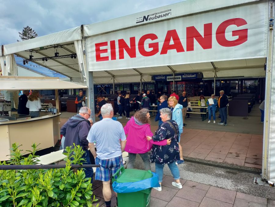 Wie schon seit vielen Jahren versammelten sich die Cabriofahrer auch 2024 wieder am Getränkestand auf dem Kärntner Bauernmarkt in Faak am See. Brigitte und Werner konnten aus beruflichen Gründen erst etwas später auf dem Bauernmarkt eintreffen, wurden jedoch von Ulli und Hans sowie Alf und Sonja kompetent vertreten. Diese begrüßten die ankommenden Cabriofahrer herzlich und sorgten für ein spontanes Wohlfühlen auch derer, welche zum ersten Mal dabei waren. Ein CFF-Wimpel in grün-weiß erleichterte dabei allen "Neuen" die Orientierung.
