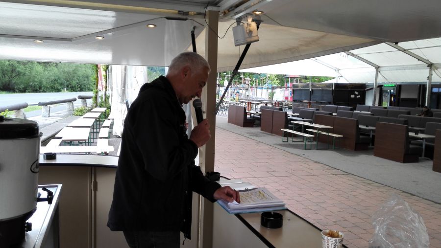 Werner begrüßte die zu diesem Zeitpunkt bereits eingetroffenen Teilnehmer und stellte das Tagesprogramm vor. Brigitte hatte dagegen den Part der Organisationschefin übernommen und waltete, tatkräftig unterstützt von Sonja und Margit, über verschiedene Listen, die Begrüßungsgeschenke, die eigens für das Treffen angefertigten Namensschilder und das "Spendenkässle" des CFF. Ulli kümmerte sich um den Kaffeeausschank und Hans und Alf sorgten auf dem Parkplatz dafür, dass alle Teams den Weg zu Brigitte und ihren Assistentinnen fanden, um dort alle bereitgelegten Utensilien zu erhalten und die notwendigen Informationen abzuliefern. Kurzum: ab 9:30 Uhr herrschte beim Arneitz Village ein reges Treiben!