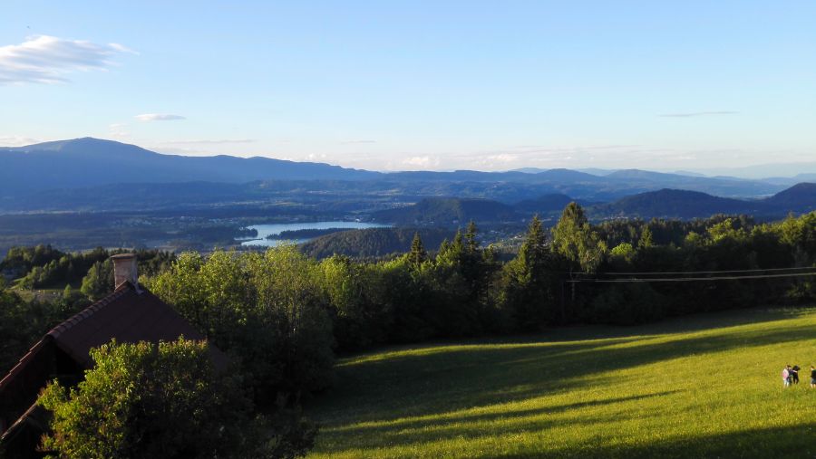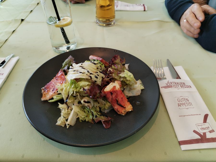 Die meisten der verbliebenen Teilnehmer trafen sich an diesem Tag zum Abendessen im Gasthaus "Bienenhütte" in Drobollach wieder. Dieses sympathische und, gemessen am örtlichen Niveau, eher preiswerte Restaurant ist auf Grillspezialitäten vom Balkan spezialisiert. Der Wettergott war uns gnädig und hatte seine Schleusen verschlossen, deshalb machte es nichts aus, dort an der frischen Luft, aber immerhin überdacht, zu sitzen. Dabei konnten wir unsere Blicke über den Faaker See und Richtung Mittagskogel schweifen lassen.