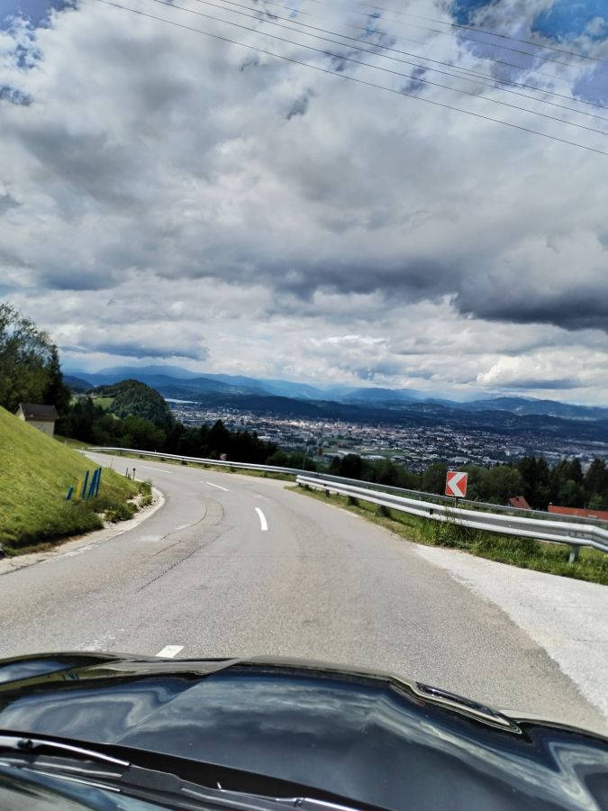 Auch die Aussicht von hoch oben auf die Kärntner Landeshauptstadt Klagenfurt war ein Höhepunkt dieser Tour. Fast am Ziel überraschte sie die Teilnehmer noch mit einer Fahrt über eine Draubrücke, der man es spontan gar nicht zugetraut hätte, dass die für den PKW-Verkehr geöffnet sein könnte. Die Rückfahrt bereitete uns richtig Freude, denn es hatte aufgehört zu regnen, so dass wir unsere Cabrios standesgemäß offen bewegen konnten.