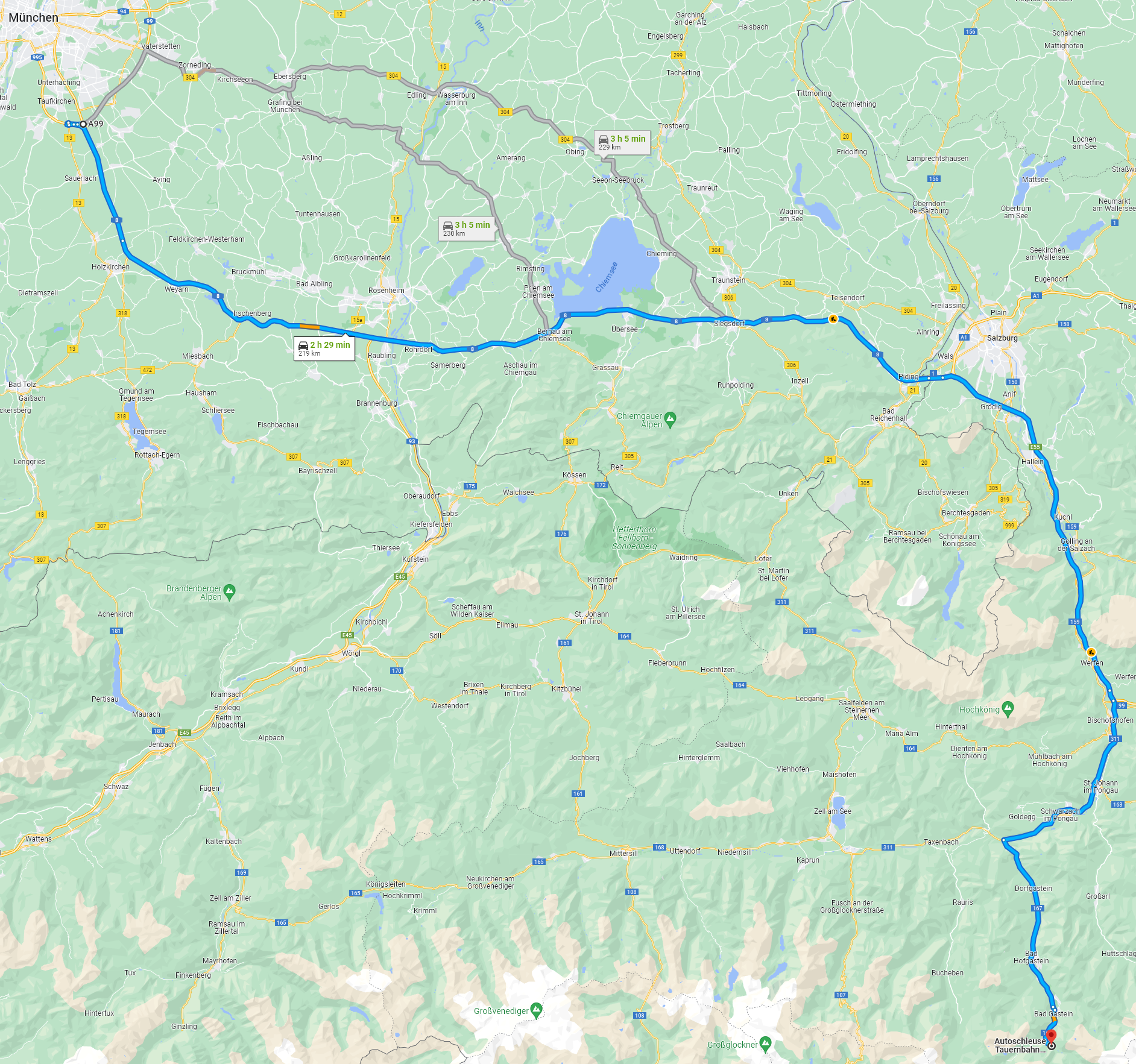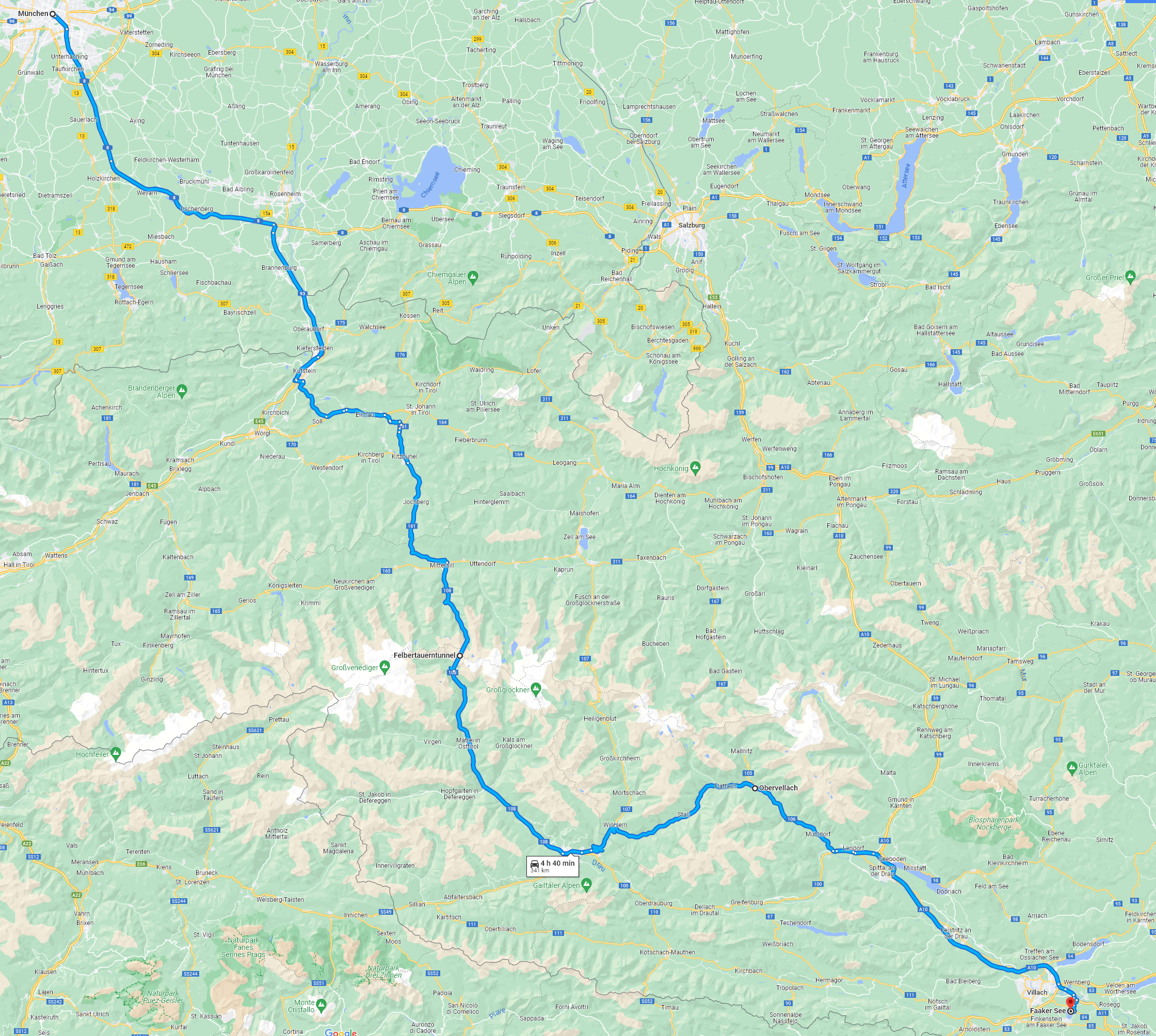 „Der Weg ist das Ziel“ als Motto: Diese Route verlässt schon recht früh die Autobahn und führt in Österreich über relativ zügig zu befahrende Bundesstraßen und den Felbertauerntunnel (Maut) zum Ziel. Ab München nimmt sie folgenden Verlauf:
