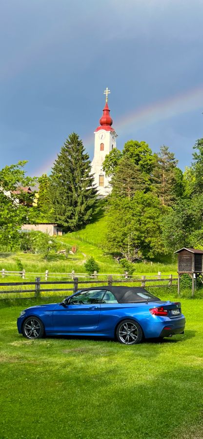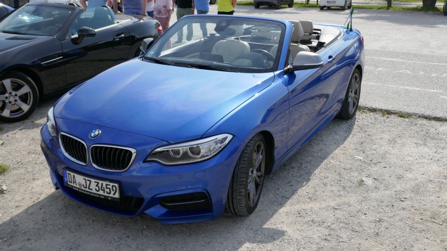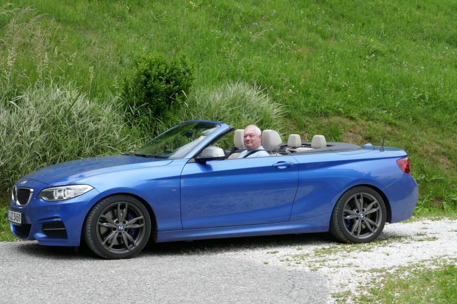 BMW verbaute eine Zeitlang bei den 4er-Cabrios und auch beim Z4 ein Stahldach, aber zum Cabrio gehört eine Stoffmütze. Nach dem M3 kam deshalb ein 135i, und aktuell fahren sie einen M235i in estorilblau: diese leuchtende Farbe passt am besten zu einem strahlend blauen Himmel bei Sonnenschein (siehe auch Plädoyer...).