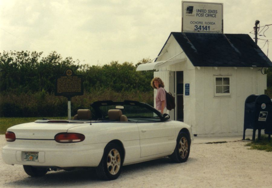 Chrysler Sebring vor dem kleinsten Postamt der USA in Ochopee, Florida (1999)