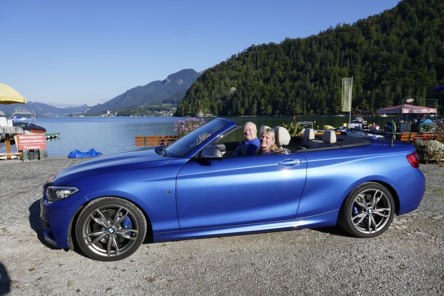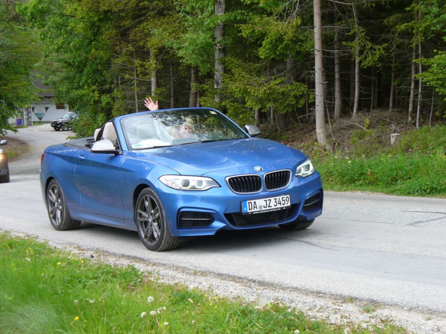 passend zum strahlend blauen Himmel, also bestem Sonnenschein-Cabriowetter.