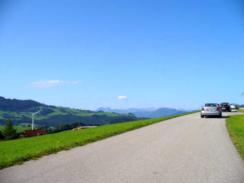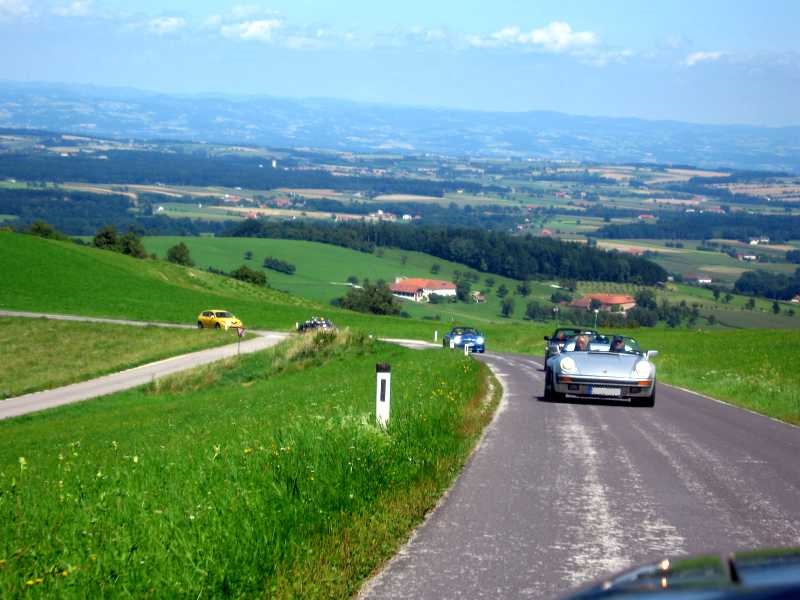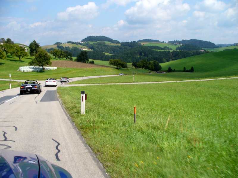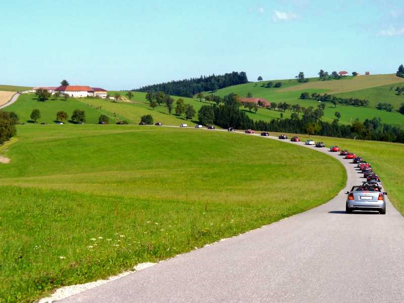 Doch dann ging's los. Mit sechs Cabrios machten wir uns auf den Weg. Noch keinen Kilometer gefahren, machten wir uns zur Aufgabe: "Wie wendet man mit sechs Autos in einer engen Straße?" Nachdem alle wieder in Fahrtrichtung standen, ging es weiter. Doch es dauerte nicht lange, da hatte sich unser Korso halbiert. Arnim und ich versuchten die Verlorengegangenen wieder einzusammeln. Unter Einsatz unseres Lebens standen wir mitten auf der Straße. Doch alles Rufen, Winken und Pfeifen nutzte nix. Wir sahen nur, wie die drei Autos sich genau für die andere Richtung entschieden.